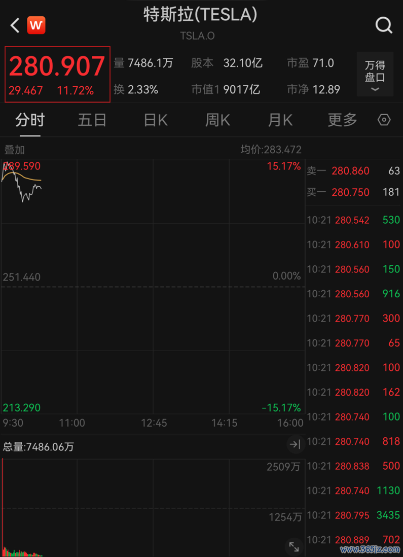 特斯拉股价最高涨15.17%。